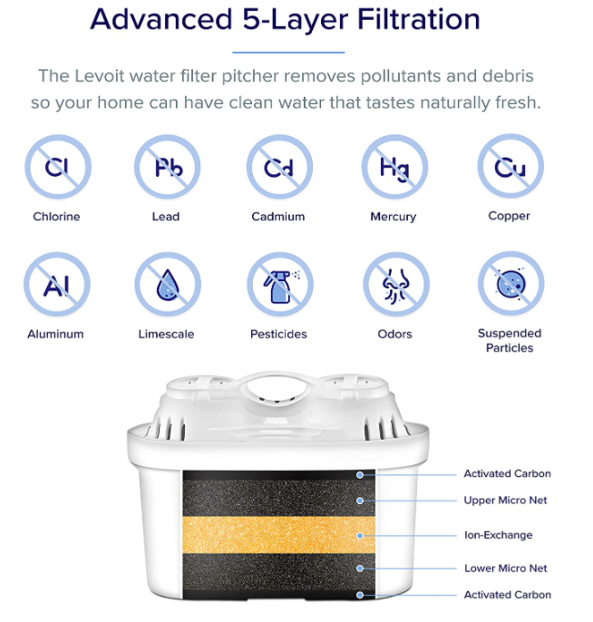 - 5-Layer Filtration: Significantly reduce chlorine and heavy metals in your drinking water with Levoit’s 5-layer filtration system. You’ll be left with quality water that tastes fresh. This filter isn’t designed to decrease water TDS, but it does improve taste, remove pollutants, and soften hard water.