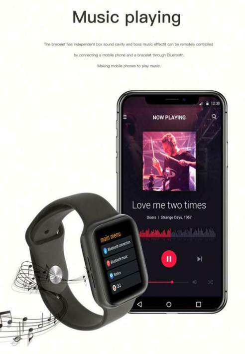 * Support Bluetooth call: Can answer call and dial call on watch. * Series 5 size. * Bluetooth notification push: SMS, news and other client information and other timely reminders. * Health detection: Heart rate/blood pressure/blood oxygen monitoring, monitoring your health around the clock. * Sports: Pedometer, calorie consumption, exercise mileage record. * Sedentary reminder: to get up and change the unhealthy lifestyle. * Sleep monitoring: Quantitatively record and analyze your sleep status. * Finding Mobile Phone Function: Loss-proof reminders. Two-way search * Bluetooth music: Connect the watch on mobile phone, when your phone playing music, music can come out from the watch, when you change music on watch, your phone music will also change. * Call reminder * Alarm clock * Calendar * Stopwatch * Calculator * Phone Book * Voice Recorder
